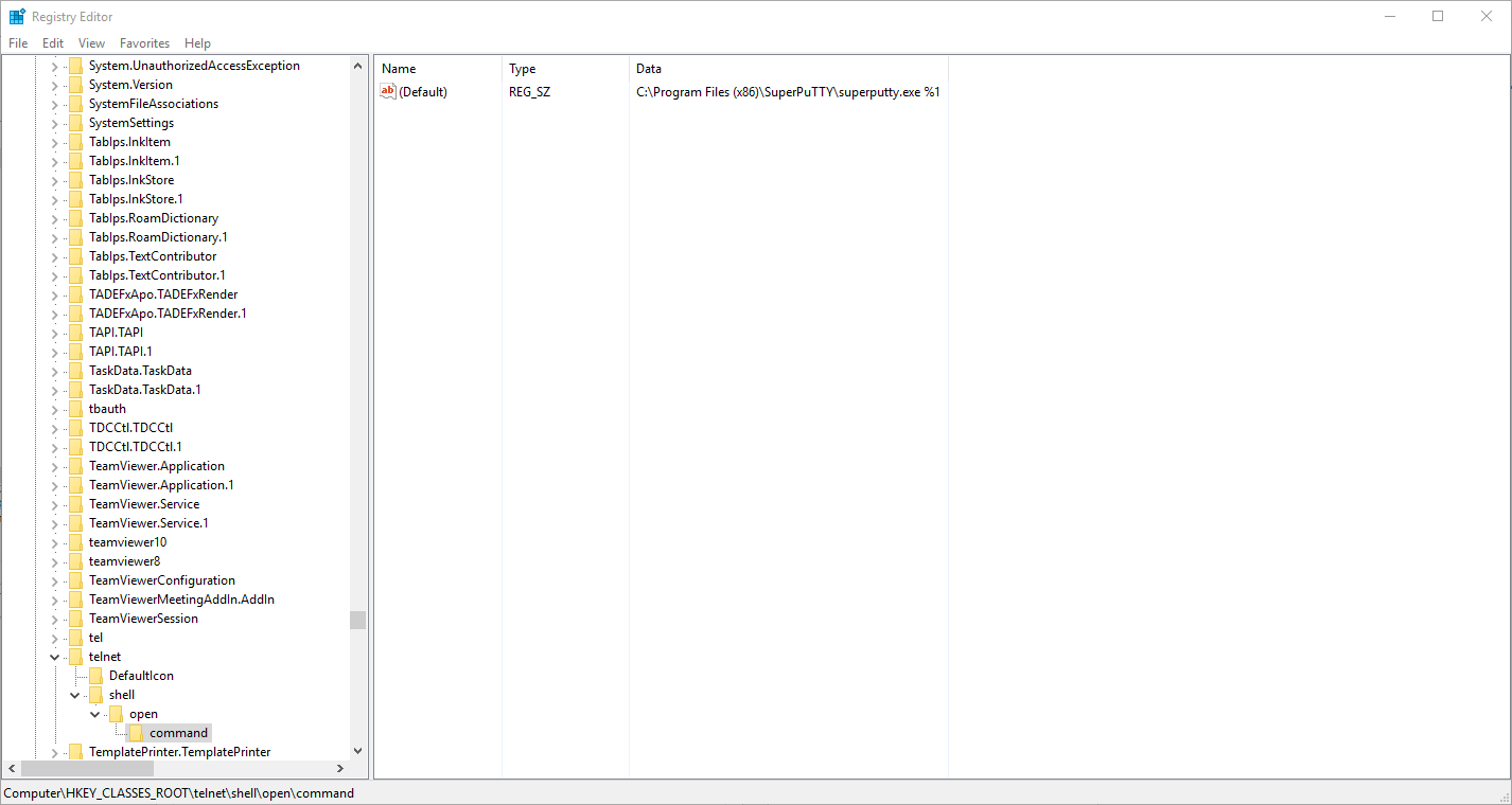 Next, we need to modify a registry setting within Windows. This registry setting is non-disruptive (meaning, you will not need to restart Windows in order for any changes to this registry setting to take affect.) The registry key is located at HKEY_CLASSES_ROOT\telnet\shell\open\command, and you will need to modify the (Default) key so that it points to the location of your SuperPuTTY executable. However, note that you will need to append an %1 to the end of the filepath, with a space between the filepath and %1. For example, my registry key reads: