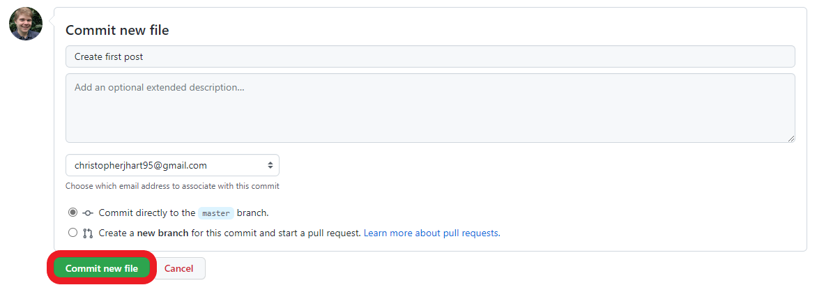 Scroll down to the bottom of the page and provide a brief description of the changes made to this file, such as “Create first post”. Then, click the green “Commit changes” button. An example is below with the “Commit changes” button highlighted in red.