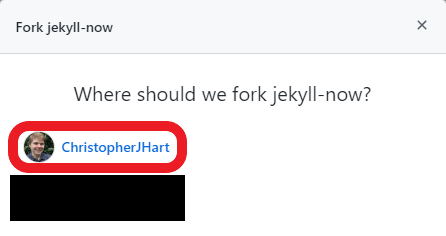 If your GitHub account has an organization associated with it, a pop-up window may appear asking you where you would like to fork the repository. Select your account from the list that appears. An example is below with the name of my GitHub account (ChristopherJHart) highlighted in red.