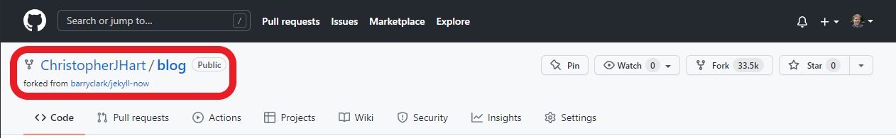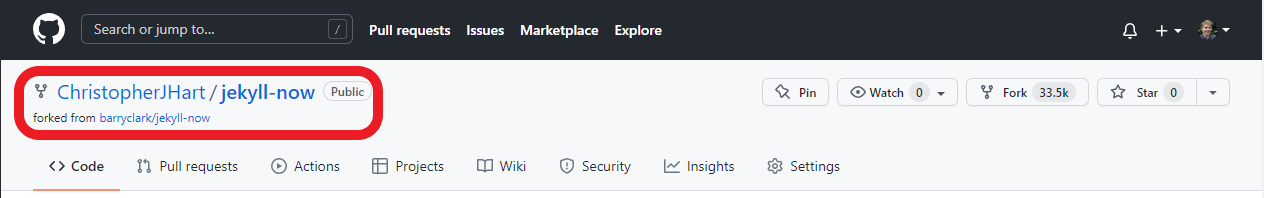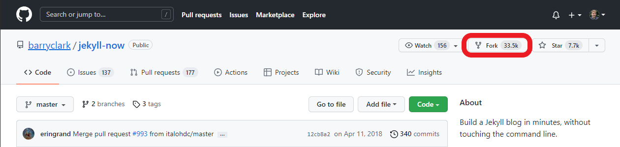 Navigate to the Jekyll Now repository, then left-click on the “Fork” button in the upper right corner of the screen. An example is below with the “Fork” button highlighted in red.