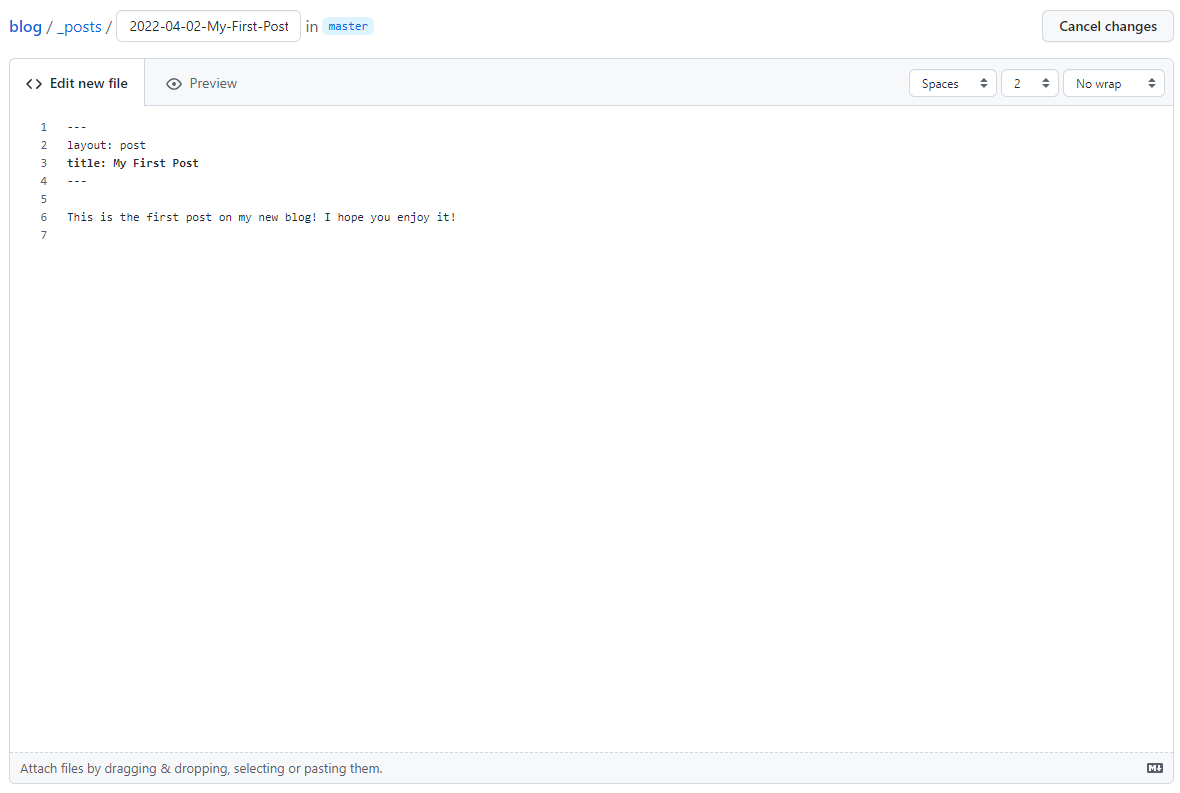 The window that appears allows you to create a new file in the _posts directory with a specific name and contents inside. I will create a file named 2022-04-02-My-First-Post.md with the contents below.