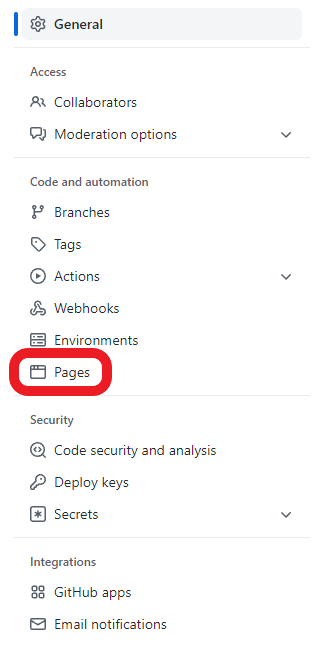 Next, we need to set up the GitHub Pages component of our blog. This will allow GitHub to automatically build and serve our website whenever changes are made to the underlying repository. First, left click on the “Settings” tab near the top of the repository. An example is below with the “Settings” button highlighted in red.