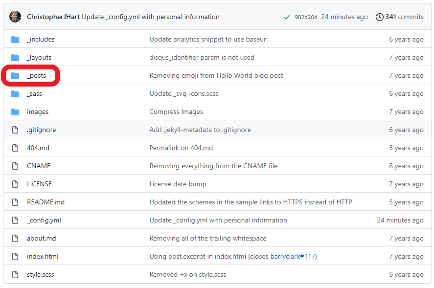 Now that our website is built and automatically deployed, we can write our first blog post. Navigate back to the root of your website and locate the _posts directory in the middle pane. An example is below with the _posts directory highlighted in red.