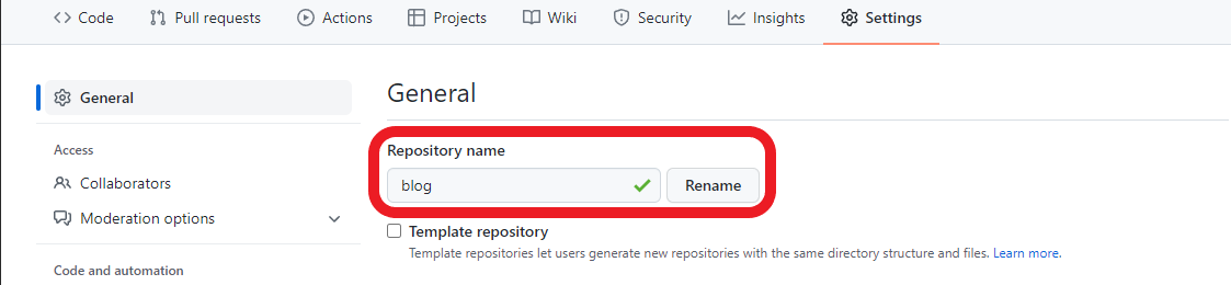 At the top of the middle pane under the “General” section, modify the name of the repository from jekyll-now to a name that reflects the name of your desired blog. If this is your personal blog, simply renaming the repository to blog works perfectly. After GitHub confirms the new repository name is available, left click the “Rename” button. An example is below with the renamed repository and “Rename” button highlighted in red.