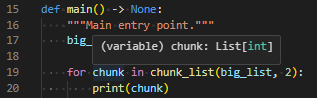 The real power from our use of generics comes when we interact with the chunk variable. If we hover over it, we see that it’s of type List[int] now, not a type of List[Any].
